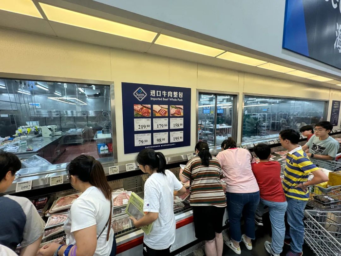 记者走访广州市场了解到,超市牛肉价格近期普遍下调了5%~10%。在天河区山姆会员商店、番禺区的万民城超市、建华汇商业中心的卜蜂莲花等地,均有特价牛肉商品,吸引大量消费者驻足选购。天河山姆会员商店内,其肉类设有专门的牛肉销售区,品类丰富,包括牛腩、牛腱、牛横膈膜、牛排、牛肩小排等,售价从39~214元/斤不等。牛碎肉39元/斤、牛腩44元/斤、牛嫩肩肉49.9元/斤。一些高端牛肉品类的价格变动并不明显,如雪花牛肉、和牛等依然保持着较高的价格水平。
