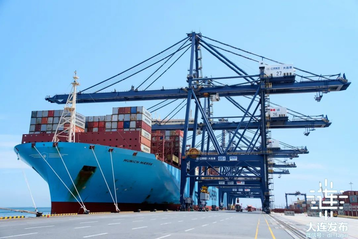 辽港集团大窑湾港区大连集装箱码头14号泊位作业现场,刚刚完成4200多个自然箱装卸作业的2M欧线“慕尼黑马士基”轮正在缓缓离泊。依托大连集装箱码头高质高效的港口装卸服务,欧洲的进口货物、腹地的出口商品在这里高效完成转运。