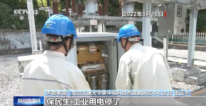 北京交通大学碳中和科技与战略研究中心主任王元丰:这种做法是对的,保民生,工业用电停了。但是工业用电停,我们也不是让它一刀切,而是让它合理有序,基于对我们用电负荷的分析,然后分级分批有序地来安排这种工业用电。未来对我们的电力建设,也不是在现在常态下来建设我们这个电力,未来整个电力系统的建设也要考虑高温带来用电负荷的增加。