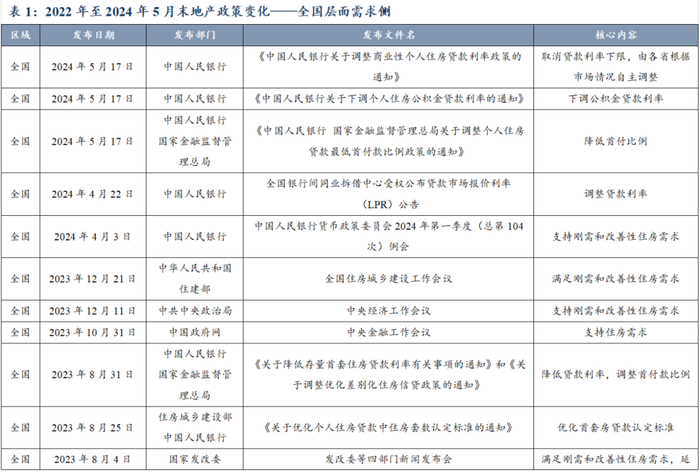 2022年至2024年5月末期间,政府在全国范围内发布了一系列政策以满足居民的刚性和改善性住房需求。政策明确了在住房贷款利率、首付比例、住房公积金贷款等方面的调整,重点在于通过灵活的金融政策来降低购房者的金融压力,激发市场需求,稳定地产市场并促进地产市场的良性循环。