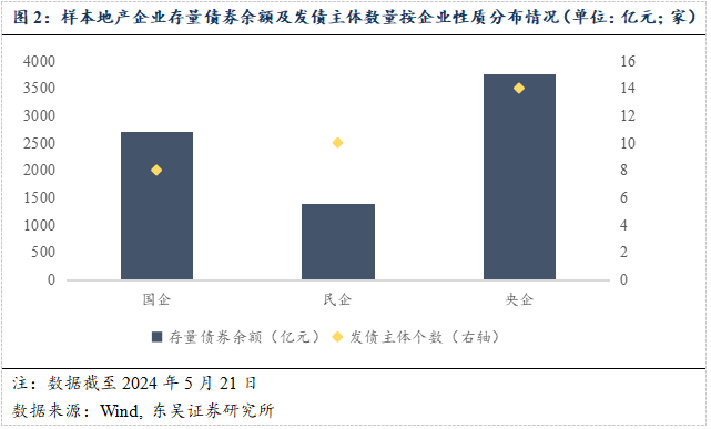 具体来看32家样本地产企业的存量债券规模,截至2024年5月21日,14家地产央企、8家地产国企和10家地产民企的存量债券余额分别约3,762.21亿元、2,708.27亿元、1,397.66亿元,即地产央企和国企的平均存续债体量分别达268.73亿元和338.53亿元,显著高于地产民企的平均体量139.77亿元,表明当前地产债板块结构已逐渐演变为央企与国企为主、民企为辅的分化格局,央企与国企在地产债市场中占据举足轻重的地位,不仅是板块内债券新增供给的主力军,同时也是板块内交易与配置的中坚力量。