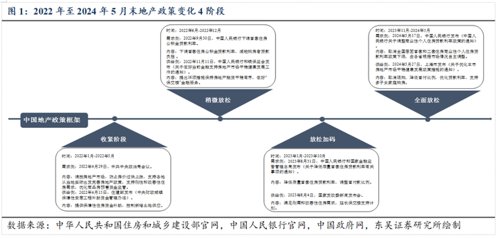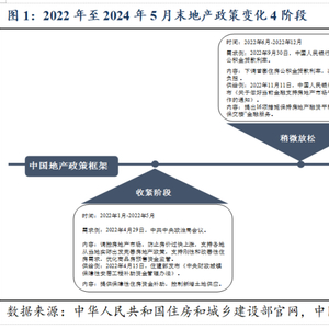 1)过去三年期间,地产政策引导市场变革可大致分为四个阶段:2022/1至2022/5“收紧阶段”→2022/6至2022/12“稍微放松阶段”→2023/1至2023/10“放松加码阶段”→2023/11至2024/5“全面放松阶段”。