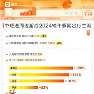 3天小长假,中短途周边游成为主流选择。滴滴出行数据显示,端午假期异地打车需求相比节前上涨34%,其中在常驻地周边城市的异地打车需求占比近50%。