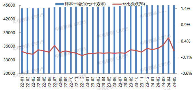 成交价格:从典型样本价格指数变化来看,2024年5月,北京新建住宅平均价格为45534元/平方米,环比上涨0.10%,涨幅收窄0.41个百分点;同比上涨1.79%,涨幅扩大0.07个百分点;1-5月,北京新建住宅价格累计上涨1.21%,较去年同期扩大1.09个百分点。
