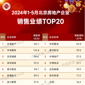 2024年1-5月,北京房地产企业销售额TOP20企业商品房销售金额合计1177.2亿元;TOP20企业商品房销售面积合计294.9万平,TOP20门槛值分别为25.8亿元和6.0万平。销售额方面,中海地产、华润置地和北京城建位居前三位,其中,中海地产和华润置地销售额均超百亿元,北京城建销售额为96.6亿元,位居第三位。