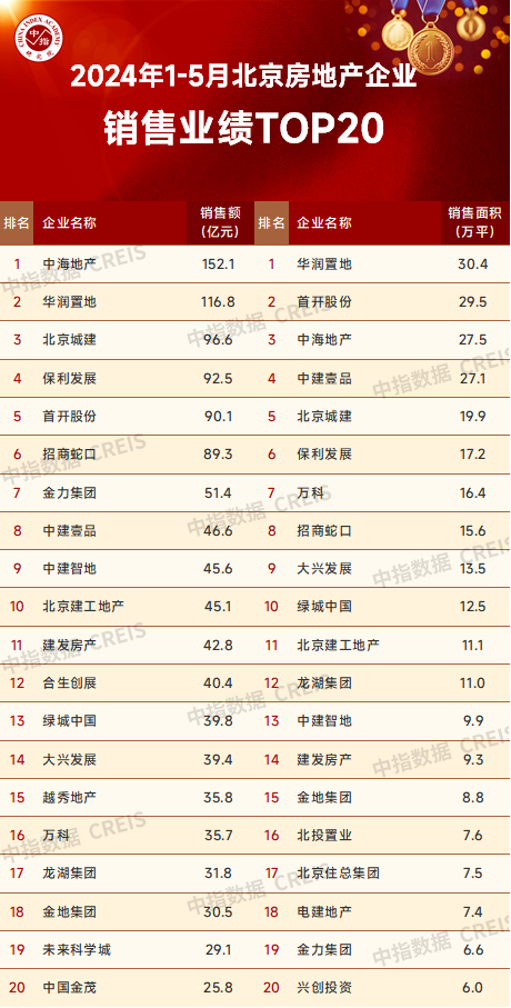 2024年1-5月北京房地产企业销售业绩TOP20