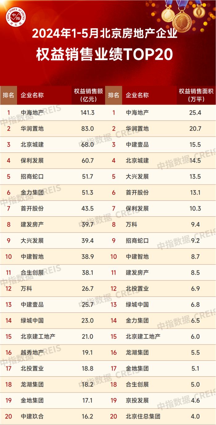 特别声明:北京房地产企业权益销售数据统计是以2024年1月1日-5月31日期间北京合同签约的商品房(不含保障房)为统计口径,主要依据中指数据CREIS(点击查看)在北京全市的监测数据,并参考当期总体经营情况和推盘去化情况进行分析统计;对于少数没有在监测范围内的项目,由企业提供相关证明文件,经课题组对数据进行严格审核,也纳入统计范围。本报告仅供参考,课题组不对使用报告及其内容所引发的任何直接或间接损失承担责任。