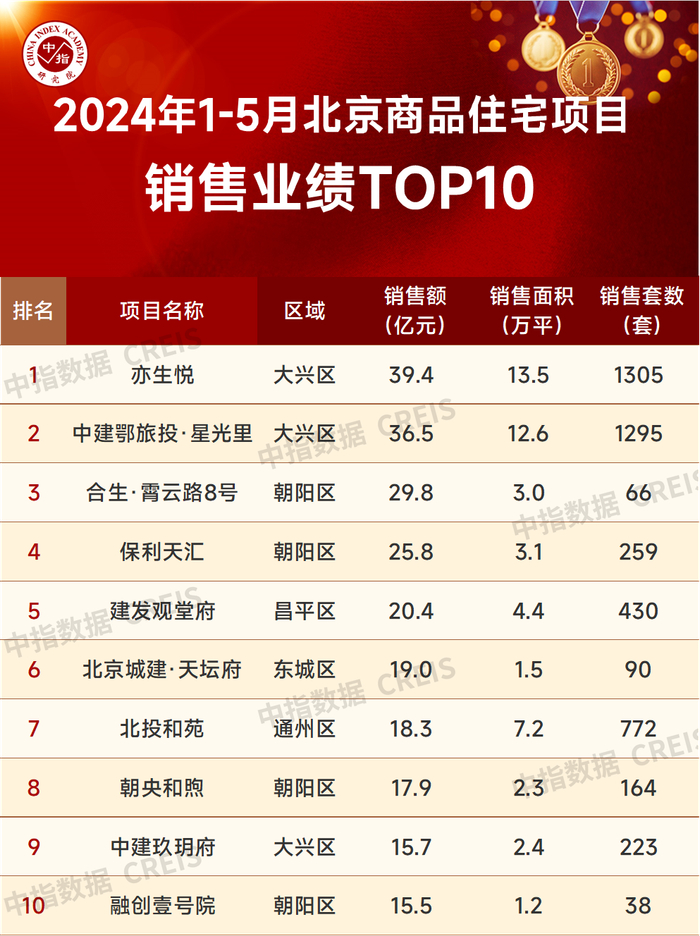 特别声明:北京商品住宅项目销售数据统计是以2024年1月1日-5月31日期间北京网签备案的商品住宅(不含保障房)为统计口径,主要依据中指数据CREIS(点击查看)在北京全市的监测数据。本报告仅供参考,不对使用报告及其内容所引发的任何直接或间接损失承担责任。