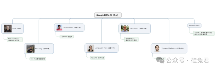 谷歌70人中有7人离开,占比10%。目前在英伟达、苹果、特斯拉、1x、OpenAI、Figure AI等企业就职,总体上来说离开谷歌的人才较少,绝大多数人才在Google DeepMind工作。