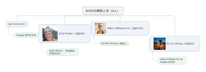 英伟达44名具身智能研究人员有4人离开,占比9%。一人去了谷歌,一人去了Allen Institute for AI研究机构,另外两人选择创业。
