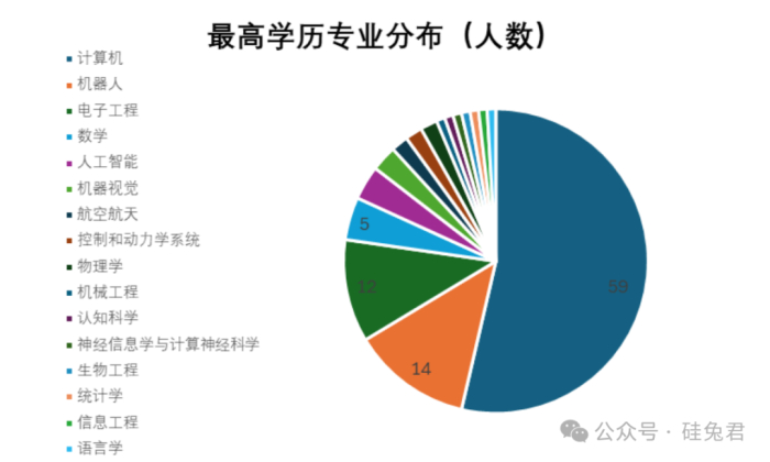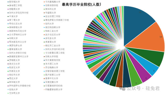 114位研究员最高学历毕业的院校总共有51所大学。其中,斯坦福大学有16人,卡内基梅隆大学有14人,麻省理工学院有7人,这三所学校的人数占比约三分之一,而其他大多数学校只有一名学生。