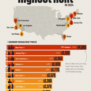 纽约市高居榜首,一居室公寓的平均月租金为4200美元,同比增长11.1%。此类公寓价格昂贵且需求量大。在美国,有一半的租房者将收入的30%以上用于房租,而纽约的居民则可以将收入的40%以上用于租房。