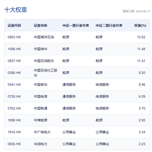 其十大权重股中,前四大均为能源股,分别为中国海洋石油(0833.HK)、中国神华(1088.HK)、中国石油股份(0857.HK)、中国石油化工股份(0386.HK),其中中国海洋石油、中国神华均在6月12日创出历史新高。另外,十大权重股中还有中国移动(0941.HK)、中国电信(0728.HK)、中国联通(0762.HK)、中煤能源(1898.HK)、中广核电力(1816.HK)、华润电力(0836.HK)。