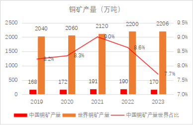 而中国铜矿需求与精炼铜消费需求总体一致,但中国铜矿产量所占世界铜矿产量比重较低,2023年中国铜矿产量为170万吨,同期全球铜矿产量为2,206万吨,仅占全球铜矿产量的7.7%。中国大部分铜矿需求依靠进口满足,中国铜产业对外依存度较高,资源紧缺的局面仍待改善。
