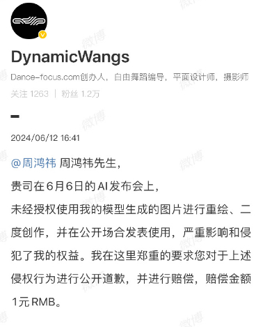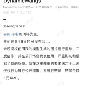 今日下午,DynamicWangs发文表示360在6月6日的AI发布会上未经授权使用我的模型生成的图片进行重绘、二度创作,并在公开场合发表使用,严重影响和侵犯了其个人权益。DynamicWangs要求周鸿祎对于侵权行为进行公开道歉,并赔偿1元。