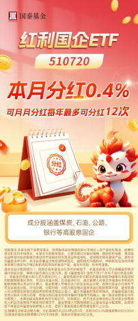 区别于市场上大多数红利产品,红利国企ETF(510720)的最大特色是“可月月分红”,在符合基金分红条件下可安排收益分配,每年最多分红12次。红利国企ETF每月均会进行月度评估,决定是否将一部分基金的超额收益以现金方式派发给基金投资者。