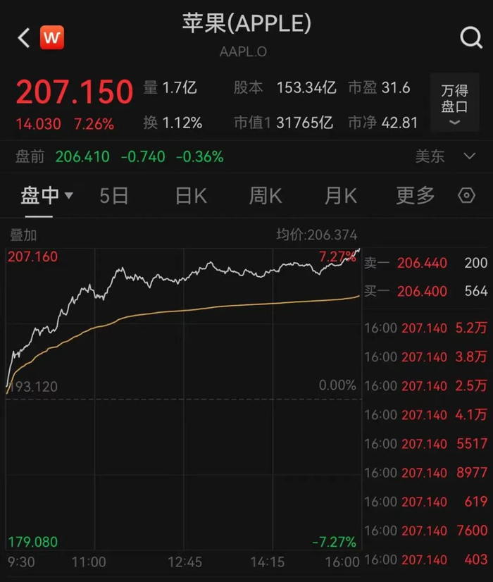 值得注意的是,苹果股价昨日大涨超7%,收报207.15美元,创出历史新高,市值重返3万亿美元上方。