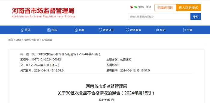 河南省市场监督管理局关于30批次食品不合格情况的通告(2024年第18期)
