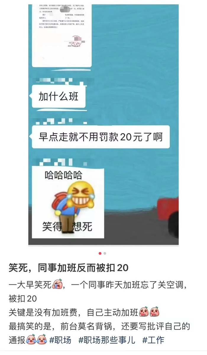 近日,有网友在社交媒体发帖表示,同事前天加班干活后,但离开办公室时,因忘记关空调和锁门,第二天就被公司通报批评+罚款20元。