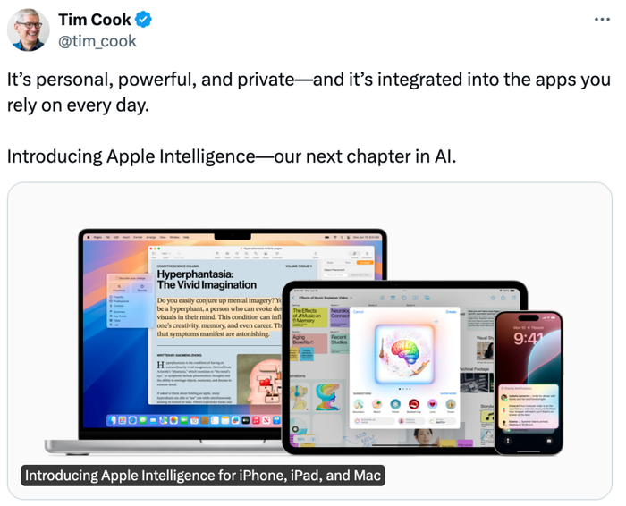 苹果CEO库克也发了一条推特,表示“Apple Intelligence是苹果AI的下一篇章”。