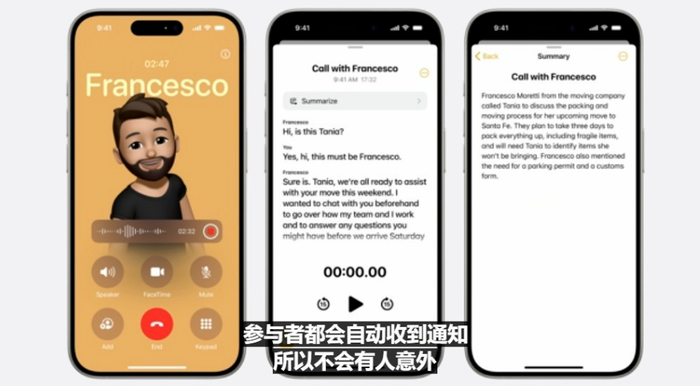 语音通话方面,Apple Intelligence能够对录音内容自动生成摘要、总结电话录音等。这个功能虽然看起来很普通,但智百道认为能够解决苹果用户的一个痛点,非常实用。