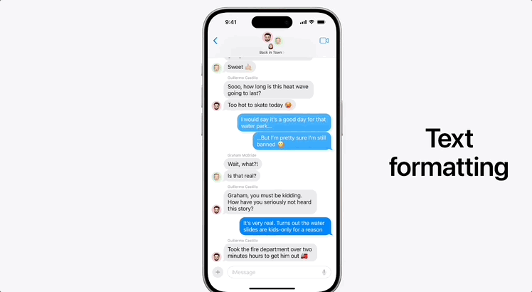 另一个最常用的APP短信(Messages)上,在信息回复中,苹果增加了更多的表情符号,并且将有粗体、下划线、删除线和斜体的新格式展示。而且,还可以给给文字添加特效。