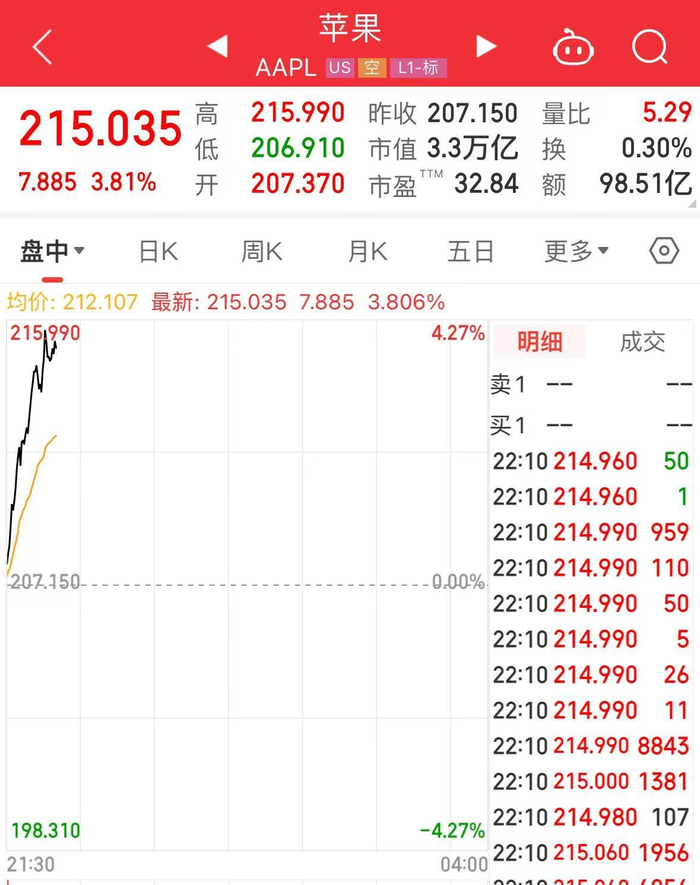 值得一提的是,苹果市值在盘中反超微软,重夺美股第一宝座,截至发稿,苹果股价涨近4%,总市值达到3.3万亿美元,苹果本周累计涨幅达9%。
