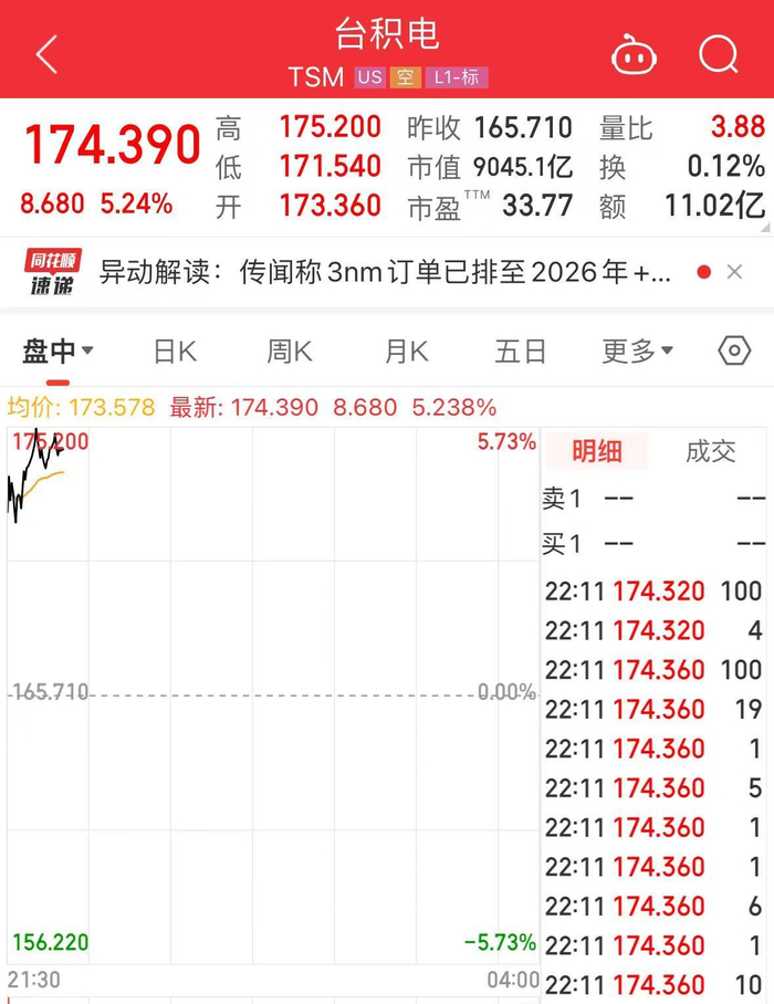另外,还值得注意的是,台积电盘中涨超5%,股价达到174.39美元/股,总市值超出9000亿美元,超过巴菲特旗下的伯克希尔哈撒韦成为美股市值第7大上市公司。