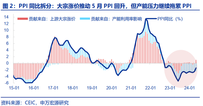 PPI:上游涨价、中下游跌价的“K型复苏”延续。5月PPI同比回升1.1个百分点至-1.4%,略好于市场预期(-1.5%,WIND),PPI同比回升主因基数走低,翘尾因素回升0.9个百分点。但是PI环比(0.2%)也有所恢复、为近7个月以来首次转正,也相应推动PPI同比中新涨价因素回升0.2个百分点。拆分结构来看:1)上游涨价对于PPI环比改善形成明显支撑,拉动PPI环比0.3个百分点。虽然国际油价下跌,但铜价、国内煤价钢价上涨。2)产能利用率继续发挥价格领先指标效果,中下游产能利用率下行继续导致相关行业价格下降,拖累PPI环比0.1个百分点。生活资料PPI、机械设备PPI等均走弱。