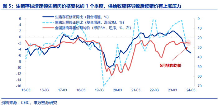 其一,前期生猪供给减少推动猪肉价格上涨,这也是我们此前猪肉价格领先指标持续指示的方向。5月猪肉CPI环比1.1%,连续两个月好于季节性,从驱动逻辑来看,23Q4以来生猪存栏持续走弱,24Q1同比更是大幅下滑至-5.2%的较低区间,同期生猪出栏同比也由正转负、下滑6pct至-2.2%,供给收缩相应对于猪肉价格形成支撑。