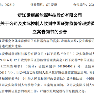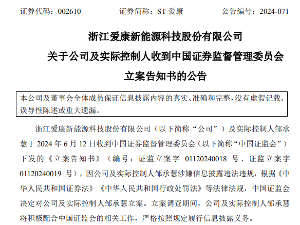 6月12日晚,ST爱康(002610.SZ)公告,公司及实际控制人邹承慧于2024年6月12日收到中国证监会下发的《立案告知书》,因公司及实际控制人邹承慧涉嫌信息披露违法违规,中国证监会决定对公司及实际控制人邹承慧立案。