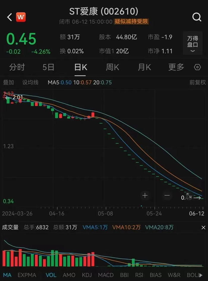 截至6月12日收盘,ST爱康报收0.45元/股,连续16个交易日收盘价低于1元/股,已经锁定“面值退市”。
