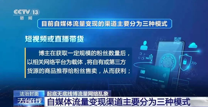 据记者了解,目前自媒体流量变现的渠道主要分为三种模式,第一种就是短视频或直播带货,博主在获取一定规模的粉丝数量后,以相关网络平台为载体,将自有或第三方货源的商品推荐给粉丝售卖,从而获利;第二种是接推广广告,博主在某个细分领域拥有一定数量的粉丝后,相关领域的商家就会主动来邀约商业合作;第三种就是直播打赏,博主通过满足粉丝的各种需求以实现打赏的目的,从而与平台按比例分成获利。