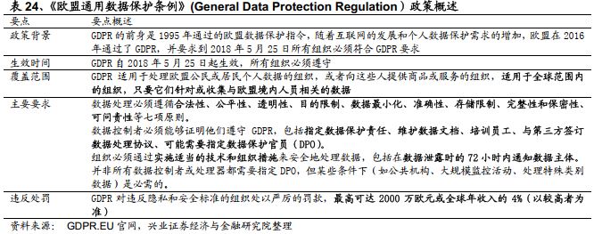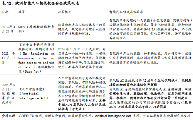 欧洲数据隐私政策我们在汽车行业的可持续政策中已经进行了基本介绍。其中最值的关注的是2018年5月25日正式施行的《欧盟通用数据保护条例》(General Data Protection Regulation,“GDPR”),以及2024年5月21日,欧盟理事会正式批准的《人工智能法案》。