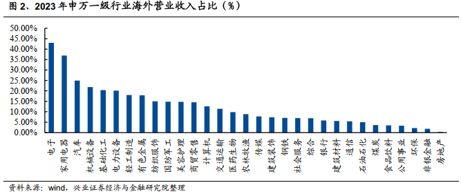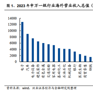 从A股企业海外营收占比来看,2023年年报数据显示,电子、汽车和电力设备行业海外营业收入总值最高,其中电子行业超过12815亿元。电子、家庭电器和汽车行业海外营业收入占比最高,分别达到43.06%、36.95%和24.96%。