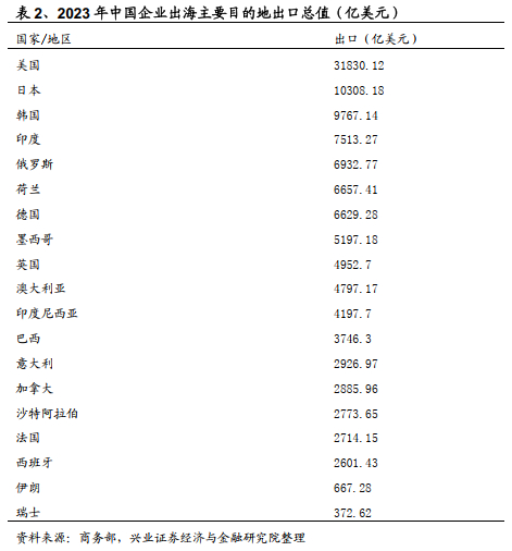 从企业的出海目的地来看,根据商务部2023年数据 ,中国企业出海的目的地中发达地区主要包括美国、日本、韩国和部分欧盟国家,新兴经济市场中印度、俄罗斯和墨西哥等国都是我国的主要出口目的地。