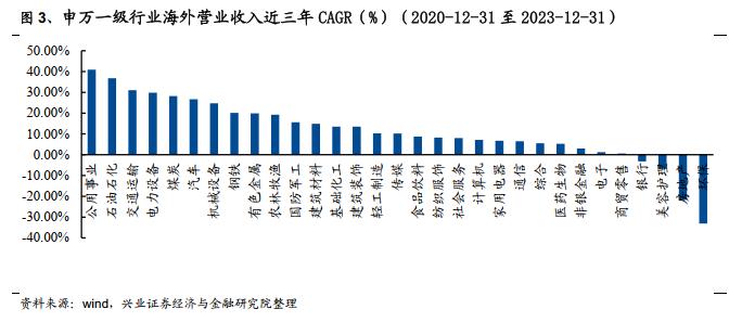 从扩张增速来看,我们用整体法计算了申万一级行业海外收入近三年的CAGR增速,发现公用事业和石油石化增速最快,分别高达40.90%和36.76%。