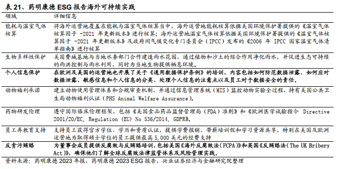 药明康德2023年发布的ESG报告和年报中详尽的披露了其核心可持续议题与全球实践。海外业务相关信息中对于个人信息保护、药物研发伦理和反腐败与反贿赂培训等议题都专门针对业务当地的法律法规进行了研究和培训。