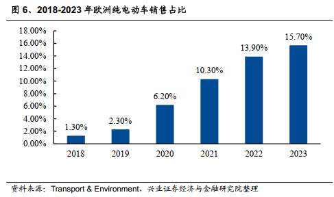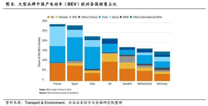 欧洲研究机构Transport & Environment(T&E)的数据称显示,2023 年欧盟所有纯电动车(BEV)销量的19.5%(约290,000 辆)是在中国制造的。这其中超过一半来自在中国生产的他国汽车制造商,特斯拉占比28%,雷诺的达西亚占比20%。从价格优势来看,中国制造纯电动车(BEV)在欧洲市场的价格平均比非中国制造商的同类车型便宜5-27%。