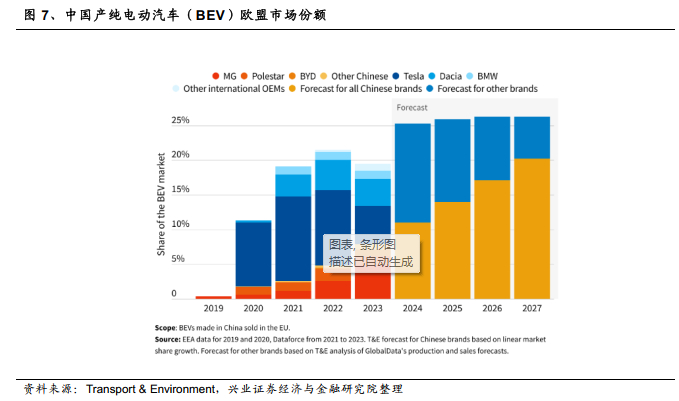根据GlobalData的预测,中国品牌在欧洲纯电动车(BEV)市场的份额将持续增长,并预计在2024年达到所有欧盟BEV销量的8.1%(168,000辆),在2025年达到8.5%(243,000辆)。而根据T&E预测,如果假设市场份额基于过去两年的线性增长,比亚迪、上汽MG名爵等中国品牌到2027年可能达到欧洲BEV市场的20%。