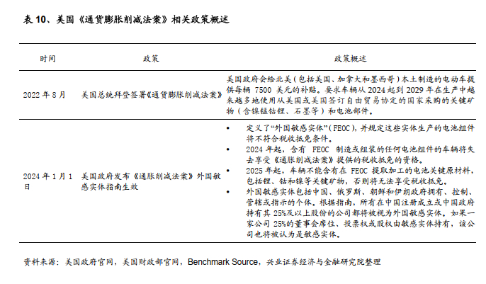 IRA包含对新能源汽车和光伏产业的补贴措施,意图促进美国本土清洁能源产业发展。随着IRA外国敏感实体指南的生效,我国直接对美电动电池组件和电池关键原材料的出口将失去税收抵免资格。