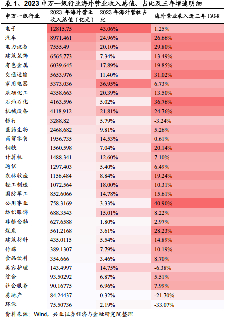 在国家政策的积极引导和全球市场需求的拉动下,中国企业国际化步伐显著加快。2023年A股年报数据显示电子、家庭电器和汽车行业海外营业收入占比最高,分别达到43.06%、36.95%和24.96%。