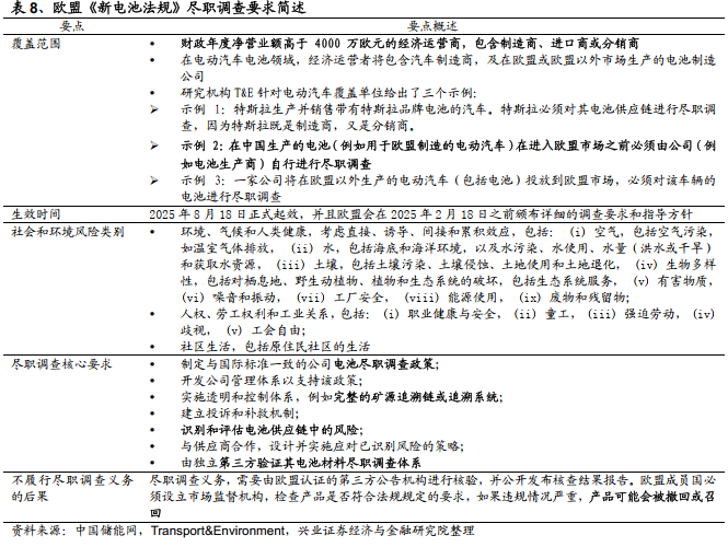 我们对《新电池法案》中的尽职调查相关要求进行进一步分析。尽职调查义务中要求识别、预防、减轻和核算电池材料供应链中的人权、环境和气候变化影响。值得注意的是,《新电池法案》对于覆盖范围内相关企业的要求包含了环境和社会两个方面数个具体方向。