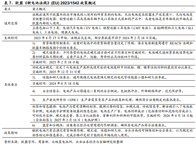2023年欧盟批准通过了《电池和废电池条例(Regulation Concerning Batteries and Waste Batteries (EU) 2023/1542)》(以下简称《新电池法规》),开始对电池的整个生命周期可持续性和安全性进行监督,关注包括电池的性能、报废要求和回收等多个方面。对于中国动力电池和电动车出口企业而言,新规中对于电池数字护照和经济运营商的尽职调查义务的要求特别值得关注。相较欧美汽车生产企业而言,中国企业在满足相关要求上仍存在一些挑战,中国电动汽车制造商可能会调整供应链管理、采用新技术以满足更高的环保标准、并可能需要通过额外的认证程序,这也可能进一步导致企业产品成本上升,影响其在欧盟市场的定价和竞争力。