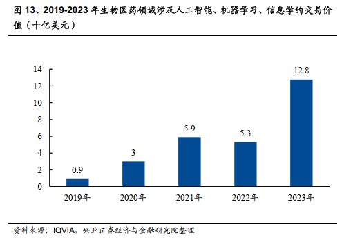 IQVIA数据显示,2023年,共有超过120亿美元的生命科学领域的交易涉及人工智能、机器学习或高级分析技术。每笔交易的价值从过去三年的平均2700万美元跃升至9800万美元。2023年生命科学领域涉及人工智能的交易中肿瘤学相关交易约占43%,其在过去五年的交易中约占35%。