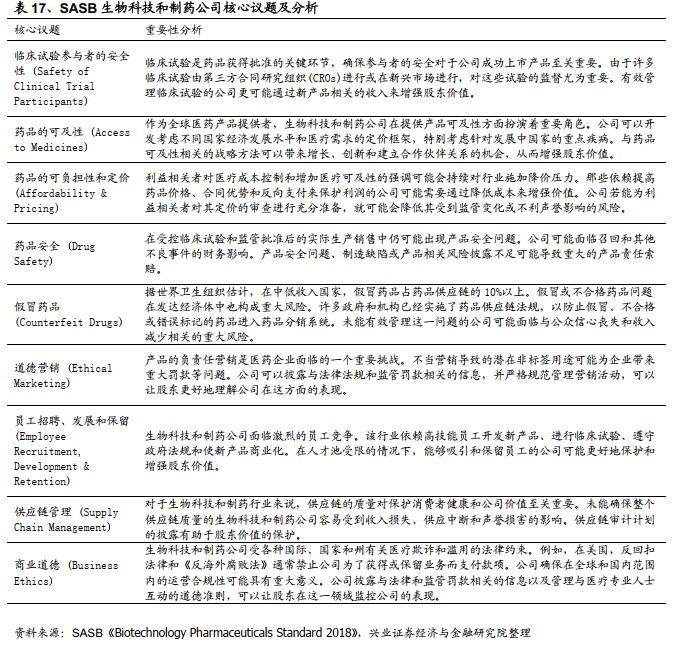 根据SASB行业核心议题研究,医药生物行业的核心议题主要集中在社会维度,包括临床试验参与者的安全性、药品的可及性、可负担性和定价、药品安全、假冒药品、道德营销、员工招聘发展和保留、供应链管理以及商业道德。其中临床试验的安全性主要为确保药品的成功上市和患者权益的保护;药品的可及性和定价策略影响着患者对药品的负担能力,也进一步影响公司在全球市场中的竞争力;药品安全、防止假冒药品的措施和负责任营销主要为保护消费者合法权益和公司的市场声誉;员工招聘与发展关系公司核心竞争力的留存和长期发展;供应链管理和商业道德政策的实施则是为了提升公司在全球运营中的合规性和透明度。