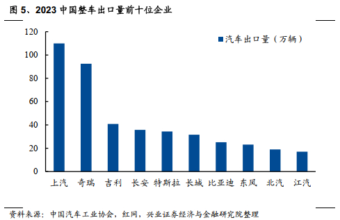 从出口企业来看,2023年中国整车出口排名前十的企业中上汽与奇瑞较其他车企优势明显。同时也需要注意到,中国出口汽车统计中包含了特斯拉这类外国车企,他们在中国生产汽车后再销往国外的这部分出口量同样包含在我国的汽车出口统计数据当中。