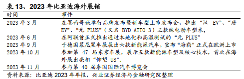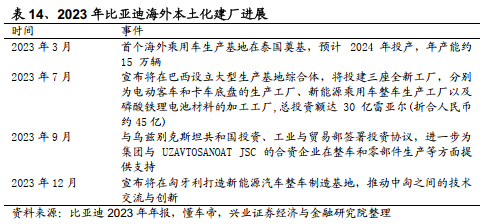 此外,比亚迪亦积极推动纯电动大巴和绿色轨道交通领域的海外市场。2023年10月,比亚迪与乌兹别克斯坦首都塔什干市政府签订协议,向当地提供 2,000 台电动大巴;12月,比亚迪向墨西哥城交通政府部门交付了首批电动大巴并投入运营。由于电动大巴和绿色轨道的合作对象多为当地政府及大型集团,因此此类合作可能为比亚迪深入了解当地法律法规以及品牌建设提供帮助。