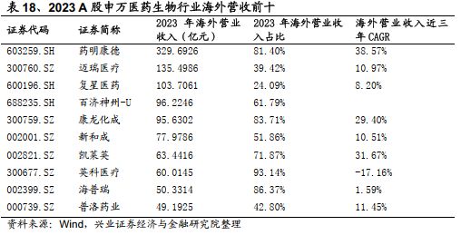 根据wind数据统计,2023年A股申万医药生物行业中海外营收总值最高的企业为药明康德。其23年海外营收占比81.40%,近三年海外营收增速达38.57%。