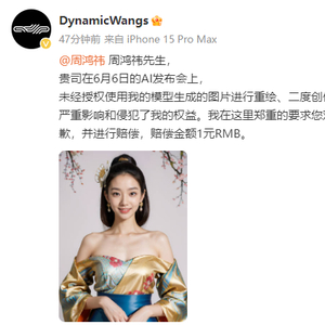 DW称:“周鸿祎先生,贵司在6月6日的AI发布会上,未经授权使用我的模型生成的图片进行重绘、二度创作,并在公开场合发表使用,严重影响和侵犯了我的权益。我在这里郑重地要求您对于上述侵权行为进行公开道歉,并进行赔偿,赔偿金额1元RMB。”